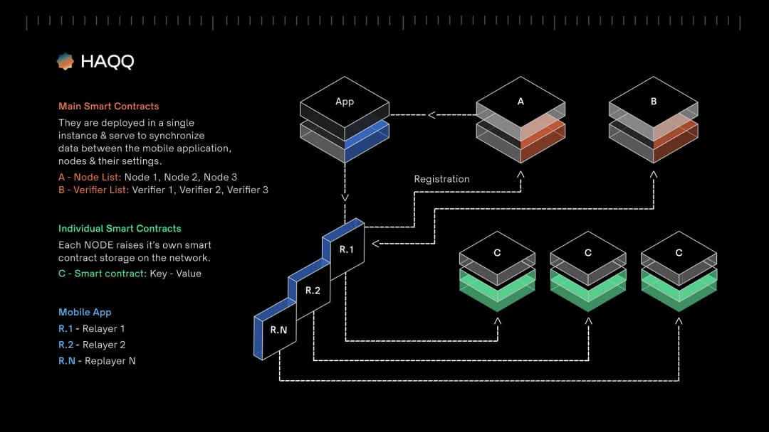 The primary function of a smart contract is to retrieve a list of Relayers that a mobile application can communicate with to interact with the network. Upon the initial request, if the hash derived from SocialID and Verifier has not been previously registered in the smart contract, the smart contract will create a new record. This involves generating an internal identifier, selecting any 5 nodes from the available node list (initially chosen randomly), and then returning to the mobile application a hash representing the internal identifier. Additionally, an array of node addresses with corresponding ball numbers (indexes) will be provided, indicating where the mobile app should store the associated data.