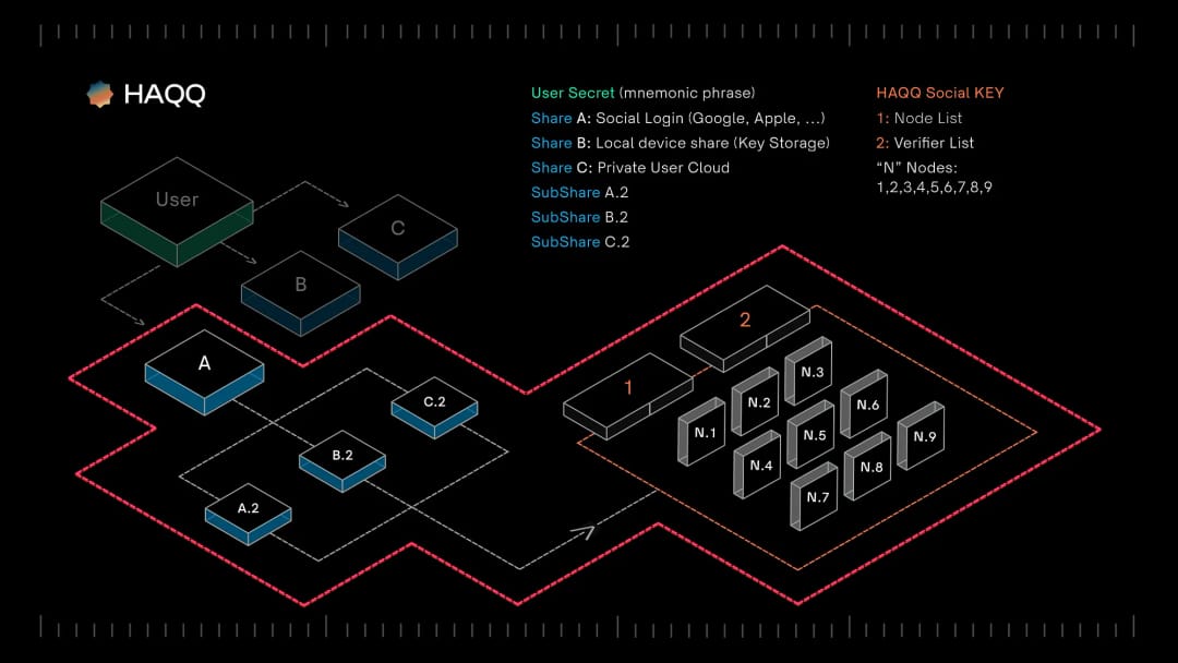 HAQQ Wallet splits the secret into 3 parts as follows: