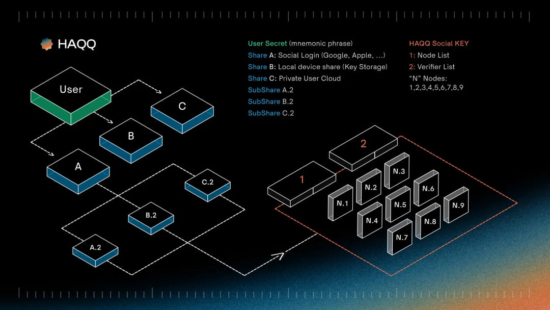 In the quest for a secure solution for storing secrets, such as private keys/mnemonic phrases, at HAQQ, we explored various options and settled on developing a solution based on Shamir’s Secret Sharing (SSS). In essence, the solution works by breaking down the secret into M parts in a way that it can only be reconstructed by having N or more parts. In continuation, let’s discuss how and where to store the parts of the secret such that only the user can reconstruct the secret.