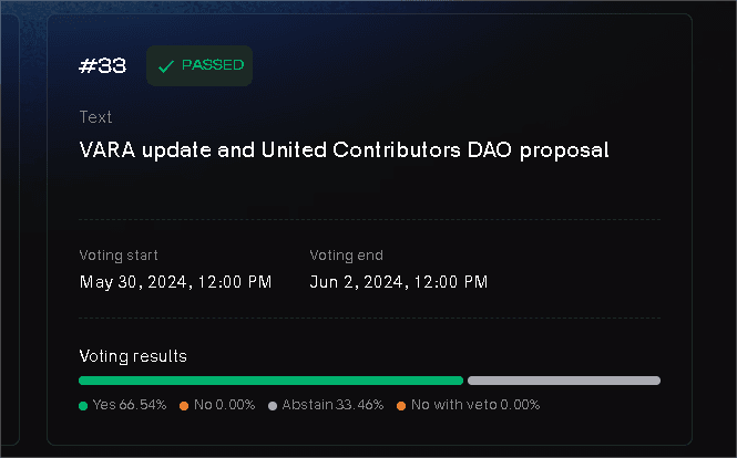 Building on the foundation of Proposal 33, Proposal 34 operationalizes the United Contributors DAO. With mainnet upgrade v1.7.6, the specified tokens were transferred to the DAO, effectively preventing any further pressure on circulating supply post-vesting and mitigating market volatility. This move reinforces our commitment to decentralized governance and long-term stability.