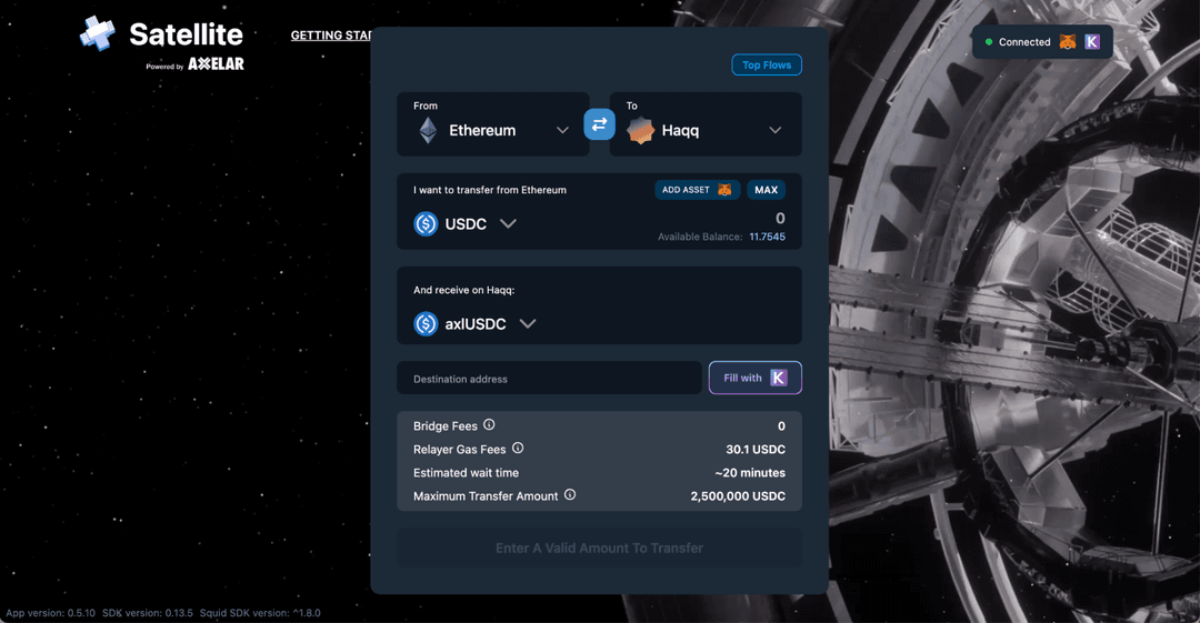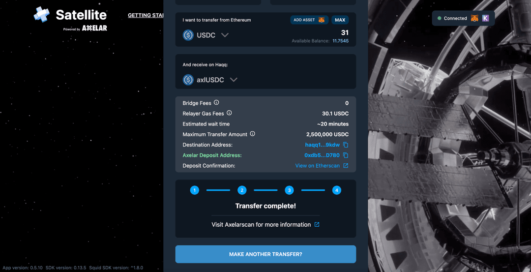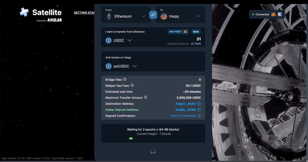 We are excited to announce that it is now possible to bridge your USDC directly from Ethereum Mainnet and 50+ chains to HAQQ and vice versa via Axelar Satellite. We are committed to achieving our vision of balancing Shariah-compliant philosophy and cutting edge technology to create a fairer, more sustainable financial system that includes the growing decentralized finance (DeFi) ecosystem.